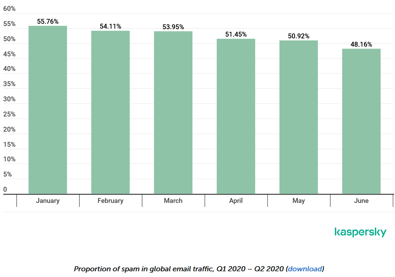 2020年第二季度,垃圾邮件的最大份额(51.45%)出现在4月份。垃圾邮件在全球电子邮件流量中的平均比例为50.18%,环比下降了4.43个百分点。