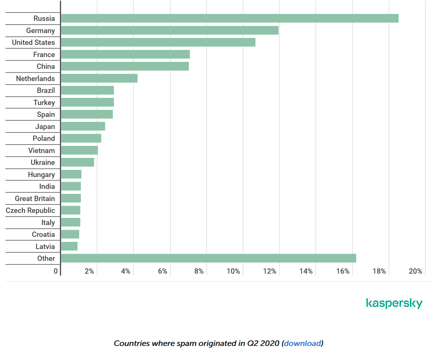 2020年第一季度垃圾邮件排行榜前五名在第二季度保持不变。俄罗斯以18.52%的份额领先,德国以11.94%的份额紧随其后,超过了美国,后者现在以10.65%的份额位居第三。法国(7.06%)和中国(7.02%)分别位居第四和第五。