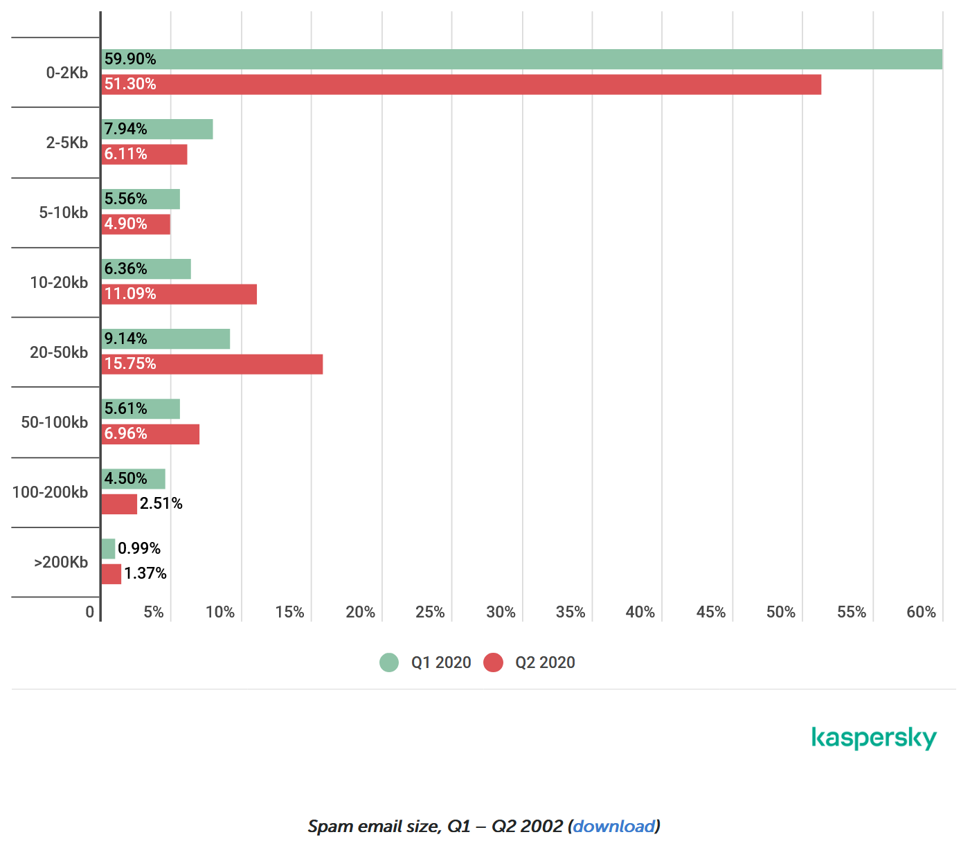 超小型电子邮件的比例下降了8.6个百分点,2020年第二季度达到51.30%。5KB到10KB之间的电子邮件略有减少,与上一季度相比,下降了4.90%。10KB至20KB范围内的垃圾邮件份额上升了4.73个百分点。第二季度100KB到200KB之间的大邮件份额下降了1.99个百分点,与2020年第一季度相比,下降到2.51%。