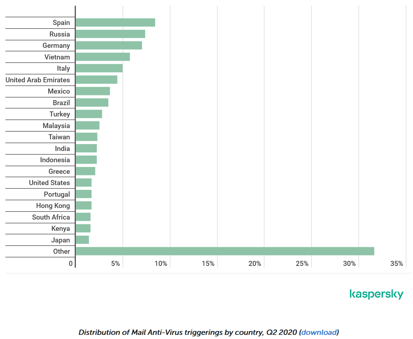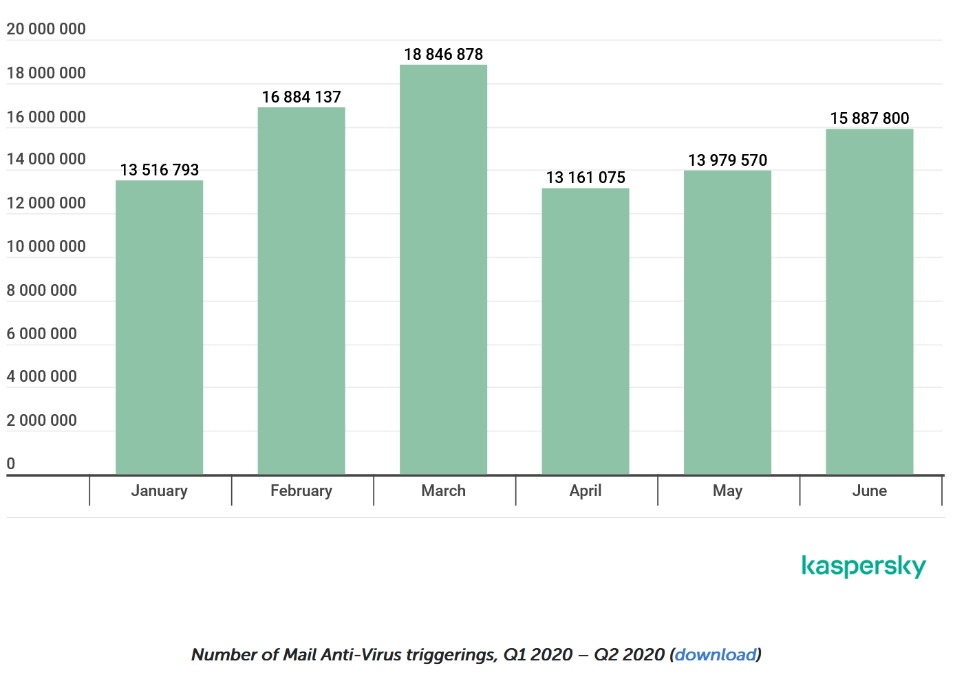 卡巴斯基在2020年第二季度共检测到4302.8445万个恶意电子邮件附件,同比增加650万个。