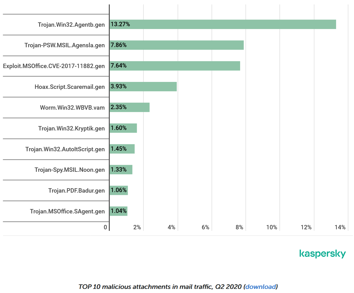 Trojan.Win32.Agentb.gen(13.27%)是今年第二季度电子邮件附件中使用最广泛的恶意软件,其次是Trojan-PSW.MSIL.Agensla.gen(7.86%)和Developit.MSOffice.CVE-2017-11882.gen(7.64%)。