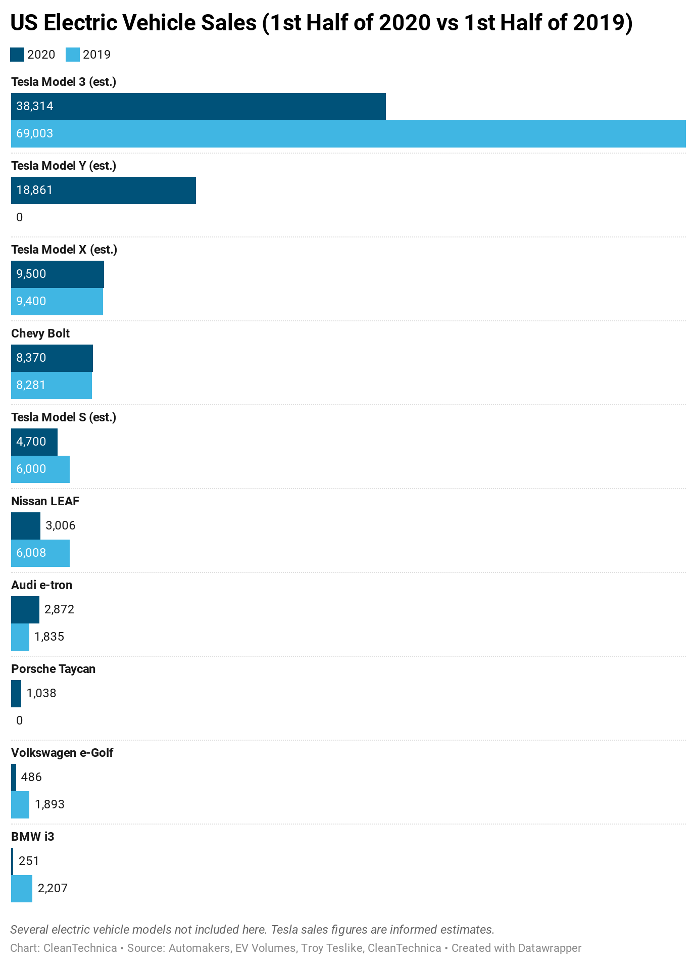 纵观2020年的数据,特斯拉仍然主导着美国电动汽车市场,特斯拉Model 3的销量是雪佛兰Bolt的近5倍,是日产Leaf的近13倍,是奥迪e-tron的13倍多,是宝马i3的152倍以上。