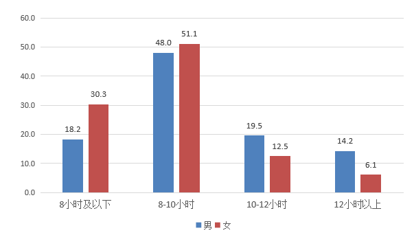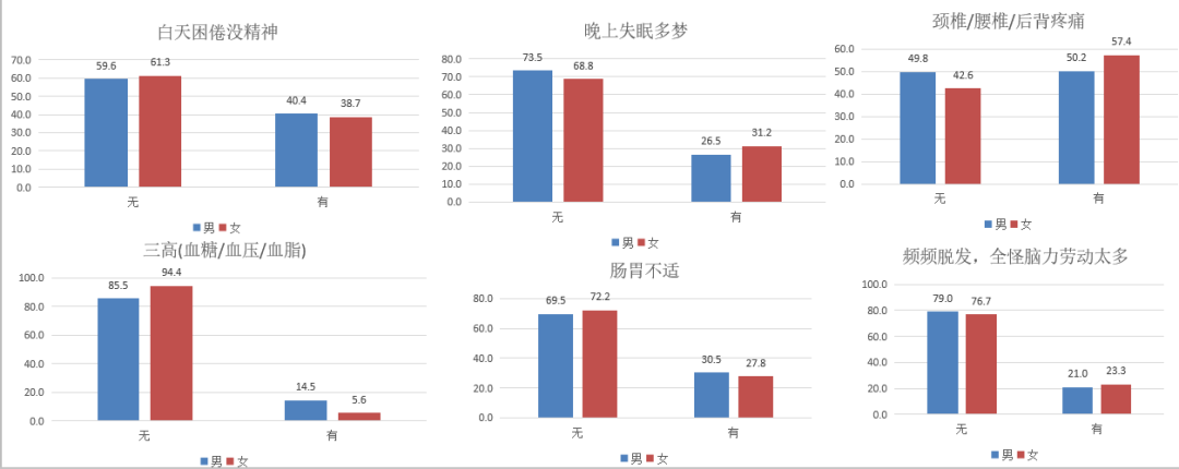 有41%的男性和34.5%的女性睡眠时间小于6小时;其中科研工作往往需要通宵达旦,大部分医师都感觉到处于疲劳状态。
