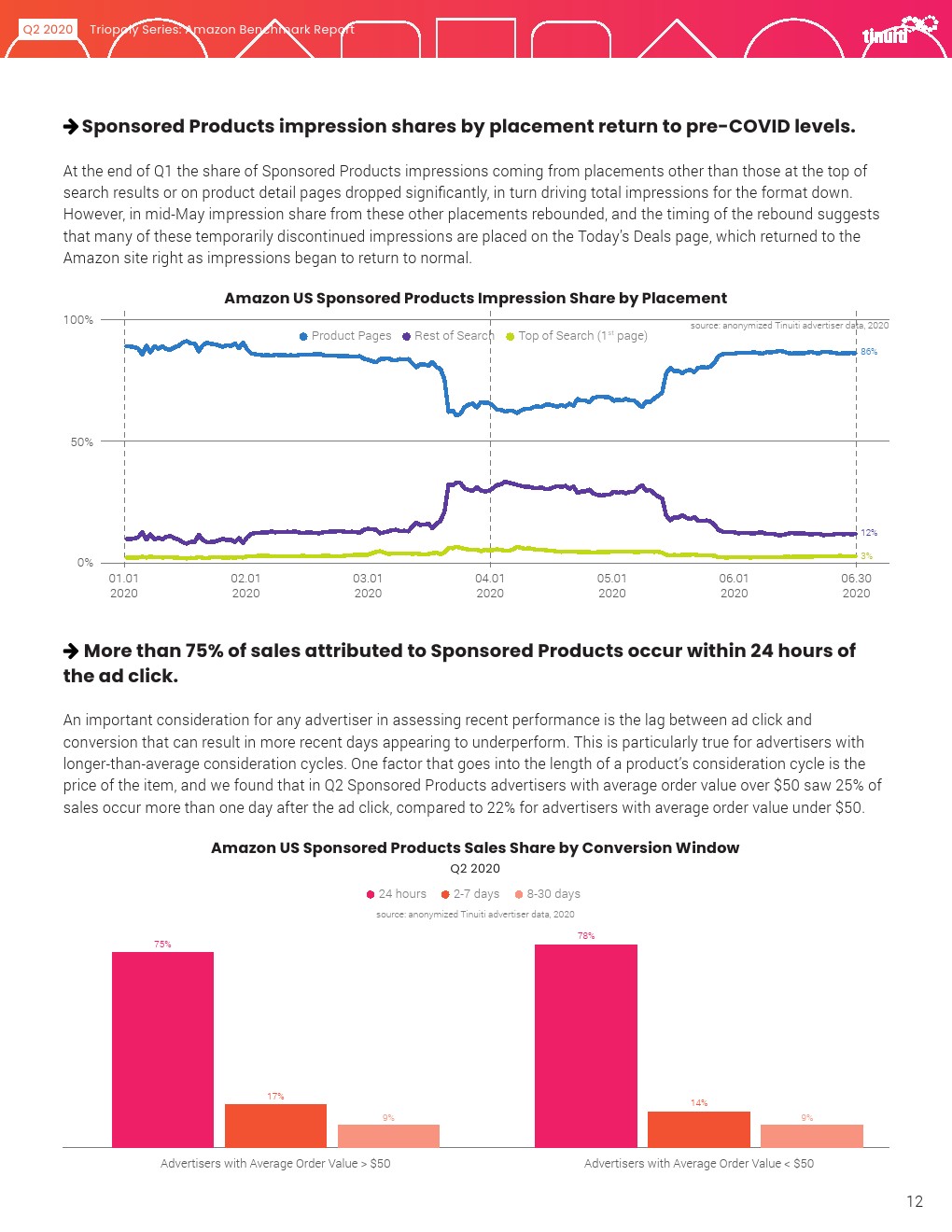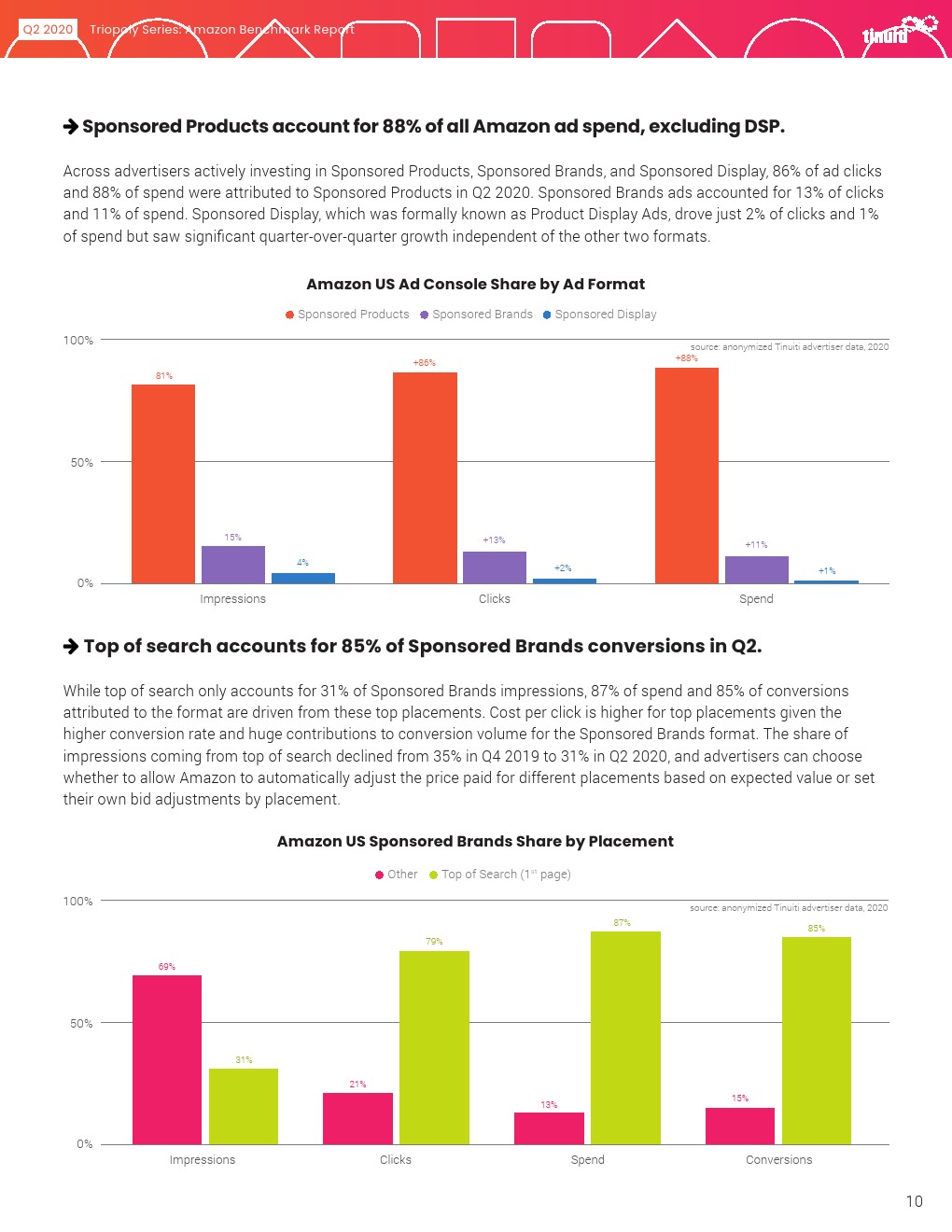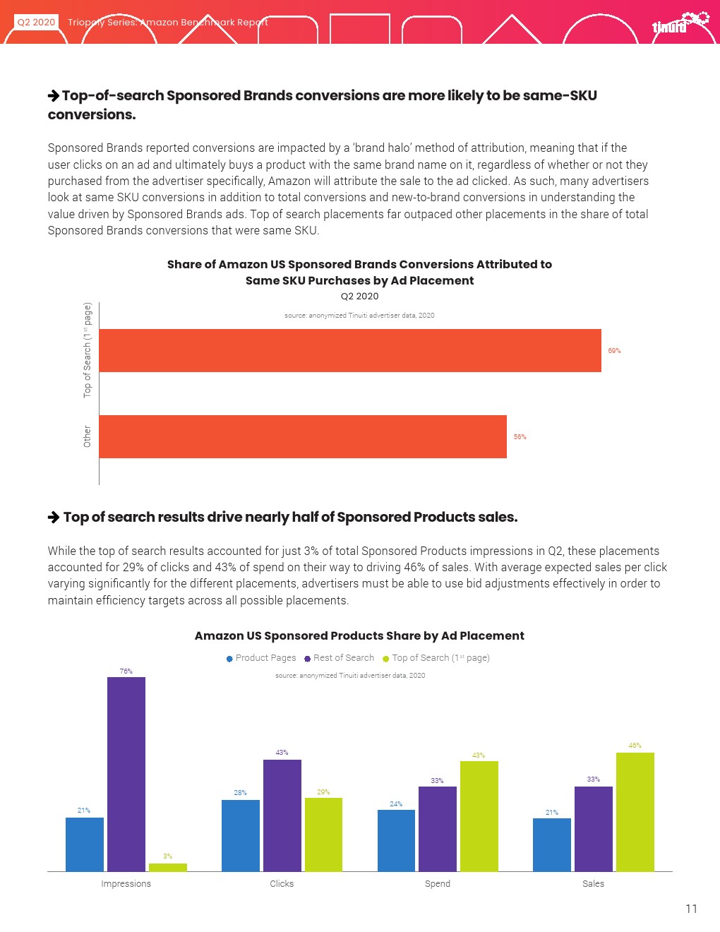 第二季度归因于赞助商品牌支出中有87%是搜索位置的顶部。尽管这些展现位置仅占赞助品牌展现次数的1/10,但约79%的点击量和85%的赞助品牌转化来自搜索排名。转化数据表明,买家更有可能从第一页顶部的结果中购买,Tinuiti之前就注意到了这一点。根据Compete的数据,这一发现甚至可以追溯到2014年。