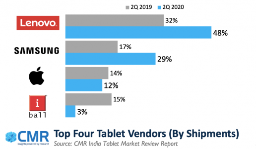 根据CMR 2020年第二季度平板电脑市场报告,印度平板电脑市场环比增长23%。这主要是由于新冠肺炎相关的封锁,以及消费者在家工作和在家学习需求的推动。