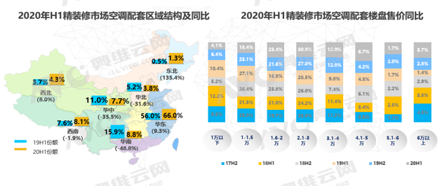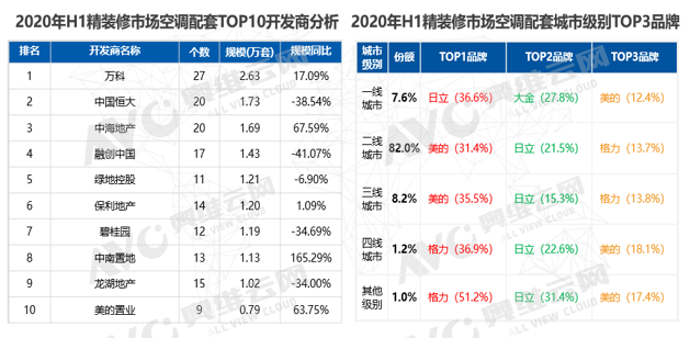 从各区域来看,东北区域增长超过135%,可见精装修空调领域在东北区域仍有较大市场。与此相比,华东区域同比增长只有9.3%,但上半年华东区域配套规模达到了28.56万套,是东北区域的50倍之多,市场占有率将近66%,一头独大。从精装修楼盘售价规模来看,1-1.5万/㎡的份额达到27.7%,占比最大,而在精装修空调市场中,2020上半年空调配套楼盘中2.1-3万/㎡的份额达到30.0%,从总体市场来看,一线城市精装修政策出台较早,市场覆盖率较高,目前精装修比例基本实现100%精装修交付,二线城市目前已经成为精装修市场的主力市场,规模最大,所占份额达82%,需求比较高,市场潜力大。