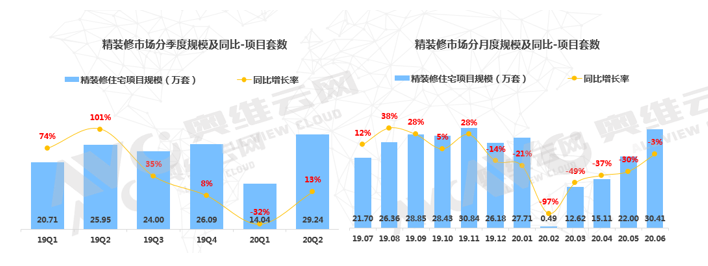 2020年受疫情影响,房地产市场受到冲击,据国家统计局数据显示:1-6月,商品房销售面积69404万平方米,同比下降8.4%,降幅比1-5月份收窄3.9个百分点。其中,住宅销售面积下降7.6%,办公楼销售面积下降26.5%,商业营业用房销售面积下降20.7%。而国内精装修市场开盘规模出现一定程度的下滑,所幸在半年“收官”中走出“V”型曲线,短暂冰封后市场开始反弹。