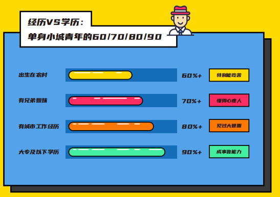 单身小城青年中,6成以上出生在农村,7成以上有兄弟姐妹,8成以上有城市工作经历,9成以上大专学历以下。其中以男性为主、有大城市打工经历、年龄在30岁以上、户口为农村、中高收入、文化程度中等、多子女家庭的单身人士更愿意通过移动互联网平台结识缘分。