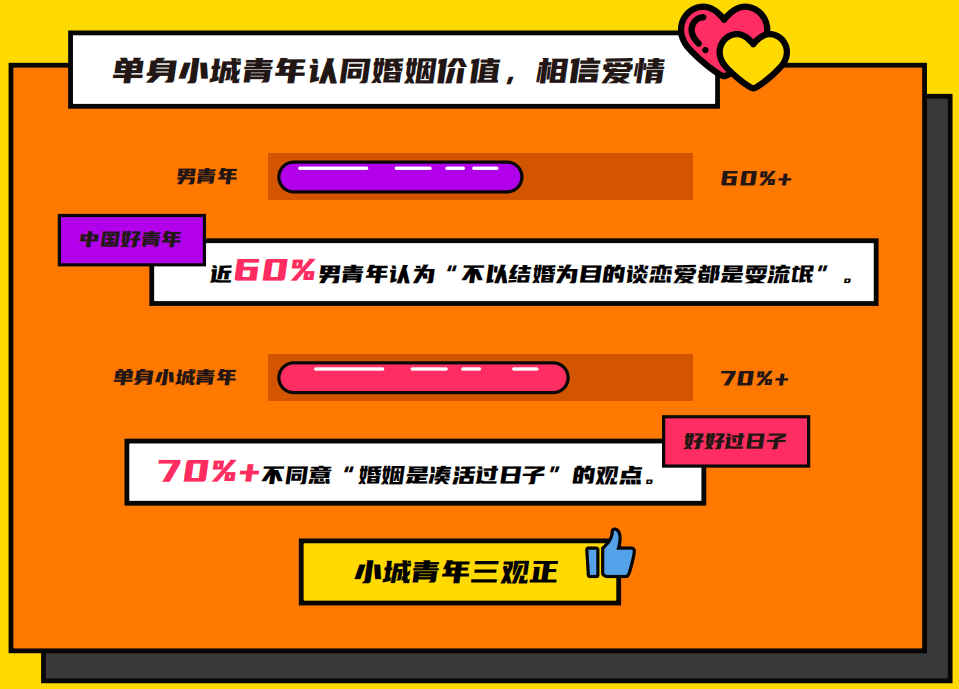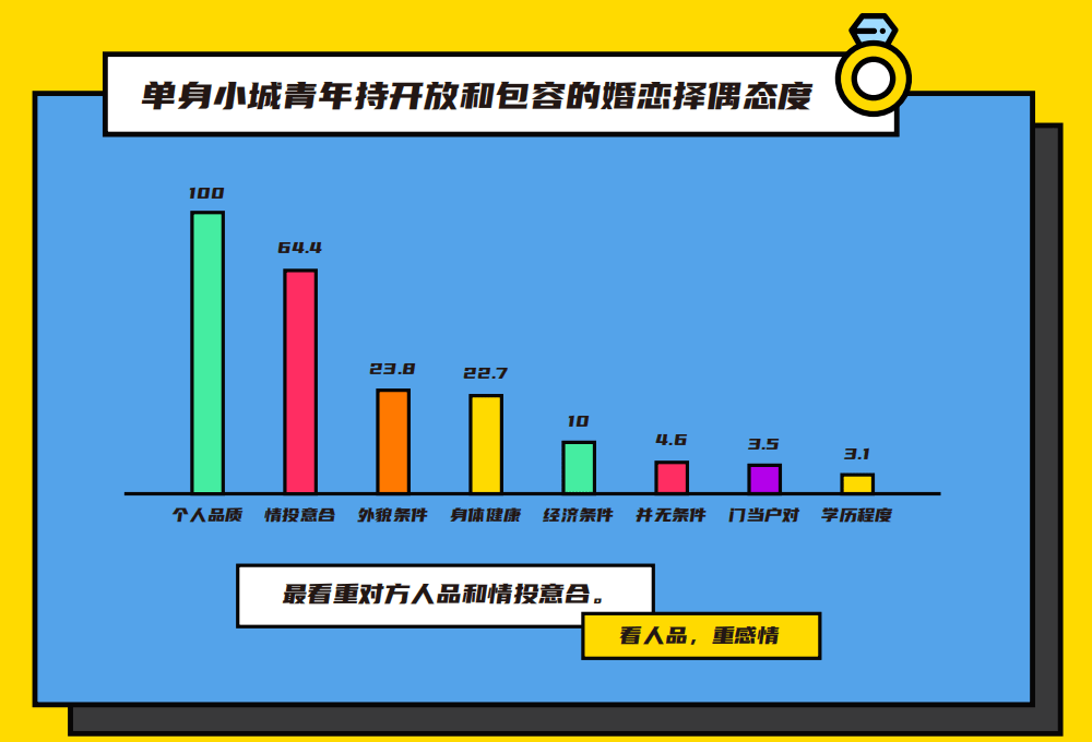 近6成的男性认同结婚的价值,7成以上的人不认为“婚姻是凑合过日子”。可见,小城青年的爱情观有三层境界:不但要牵手,还要白头,更要幸福。