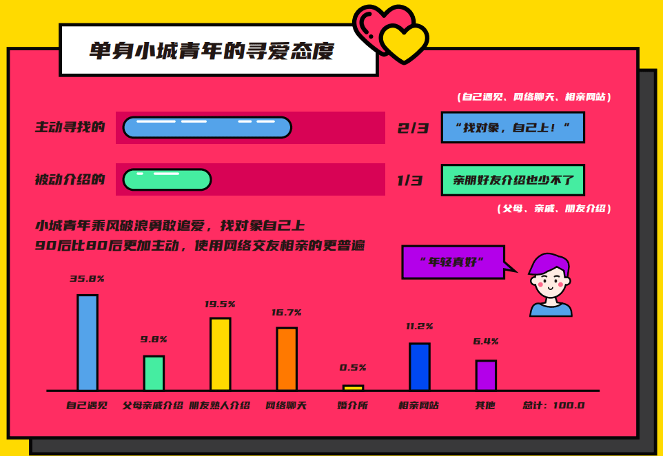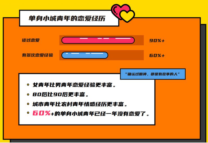 通过报告我们看到,单身小城青年的情感生活丰富多彩,恋爱经验和性经验并存,打破了传统的人身依附的关系,日益成为独立个体间的情感选择。同时,因城市化境遇的差异(如农村户籍)和恋爱、婚姻市场上的地位差异(如性别、年龄、收入)而遭遇各种情感挫败。此外,存在着性别、年龄和收入的分化,女性、自评高收入者、城市户籍青年拥有更多的婚恋机会;低收入者、农村户口的男性则在情感生活中面临更大挑战。