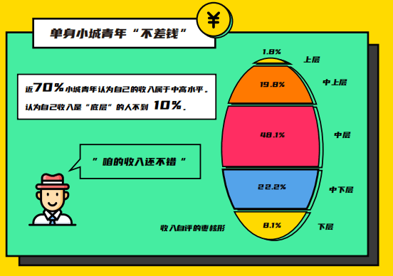 收入自评中,近7成的单身认为自己的收入水平处于中高水平。从社会分层看,单身小城青年自认的收入水平呈现中下层略多的“枣核型”,认为自己属于“中层”、“中上层”和“上层”的人达69.7%;只有不到10%的人认为自己属于“下层”。