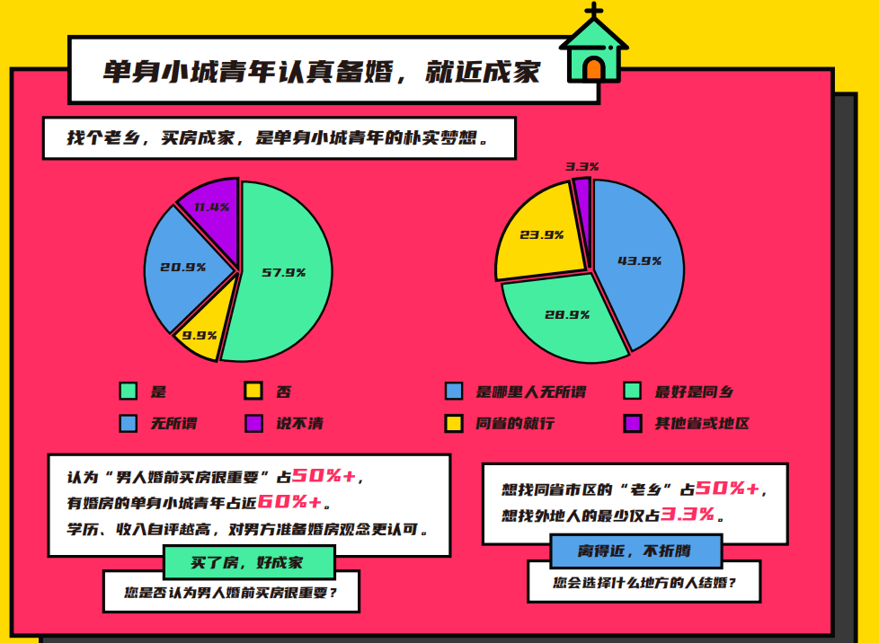 有意愿找本省市区的“老乡”占5成以上。找个老乡,买房成家,是小城青年朴实的梦想。这种浓浓的“乡土情结”确实与大城市大不同。