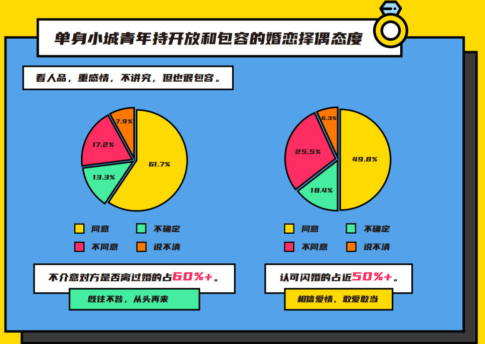 有6成以上的人不介意对方是否有婚史,5成以上认可闪婚。可见,小城青年持开放包容的婚恋态度。