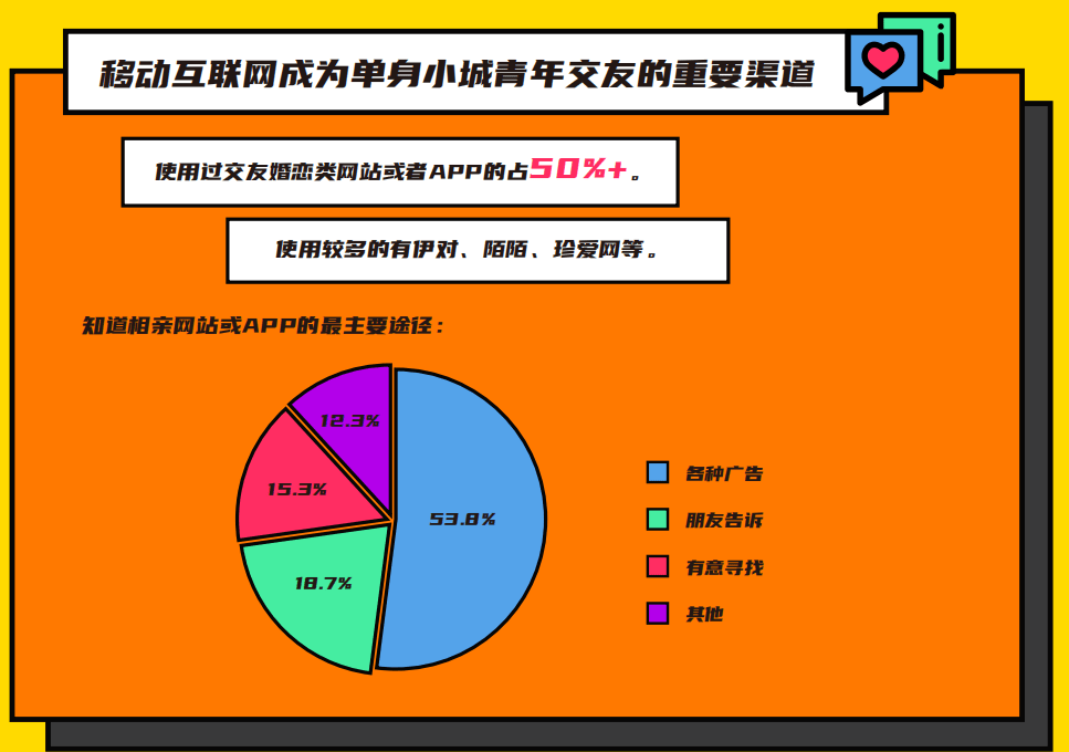 移动互联网成为单身小城青年信息的主要来源,使用过交友婚恋网站或者APP的占5成以上。