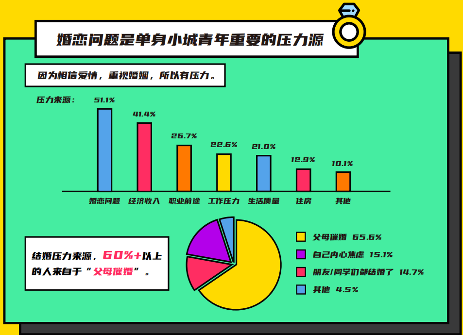 婚恋问题是单身小城青年重要的压力源。有超过5成的人认为婚姻问题是最大的压力源,超过经济收入、职业前途、工作压力和住房等。有6成以上的人表示,婚姻压力来源于父母催婚,这一点或许与小城这种半熟人社会特点有关系,青年们还要受到家庭、家族等社会关系的支配。