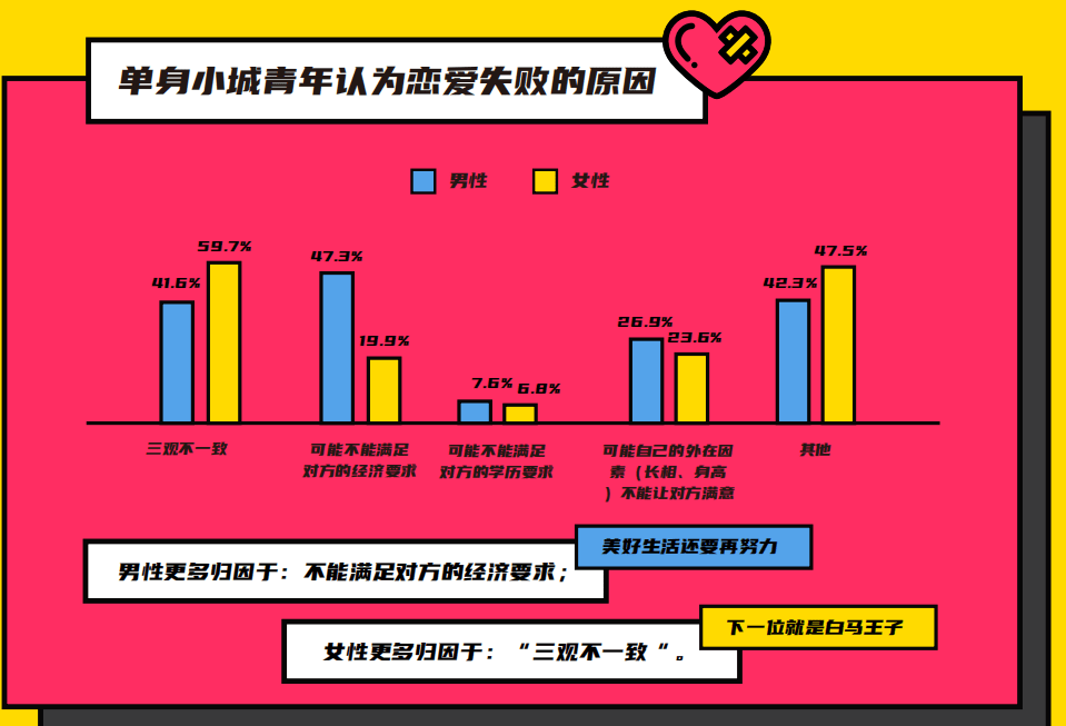 恋爱失败的原因,男性更多归结为不能满足对方的经济要求;而女性则更多归因于“三观不合”。男性更倾向于用工具理性做解释,女性更倾向于用价值理性做解释。
