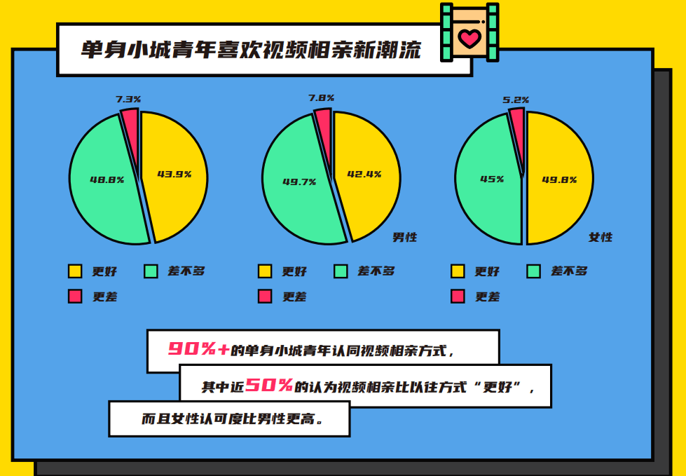 有9成以上的单身小城青年认同视频相亲方式,近5成人认为视频相亲效果更好。4G以及5G技术为新的互联网应用奠定了基础,短视频和直播平台迎来技术红利期,从而催生了伊对、抖音、快手等一大批新的社交应用,各领风骚,风头正劲。视频相亲以其更实时、更真实、更便捷、更有趣的特点赢得了年轻一代的追捧。