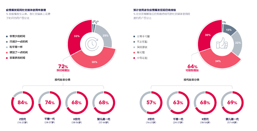 值得注意的是,用户期待这种行为继续下去。这个群体中大约三分之二的人表示,一旦居家限制解除,他们可能会继续以同样的程度使用社交媒体。