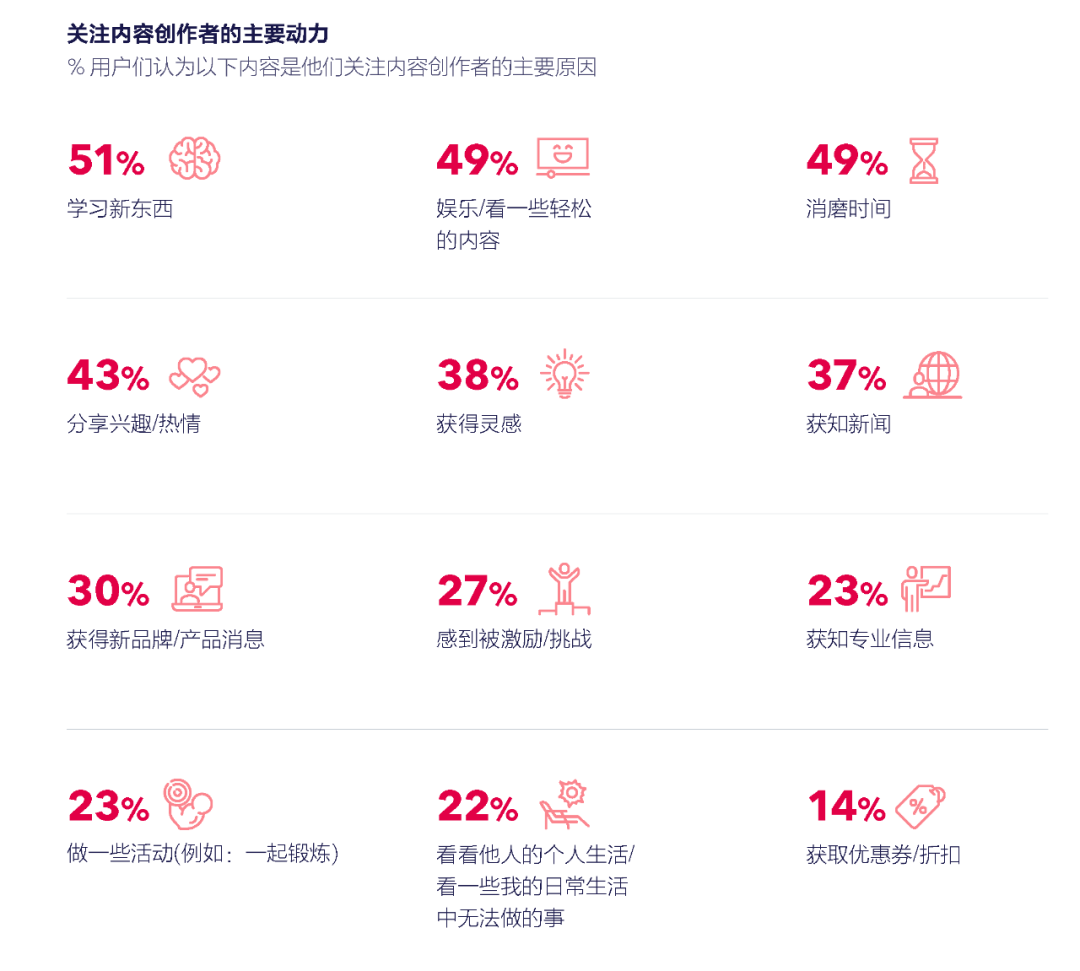 那么用户与创作者互动的原因是什么呢?在美国和英国,关注创作者的主要激励因素是学习新的东西(51%)、娱乐/提升内容(49%)或消磨时间(49%)。