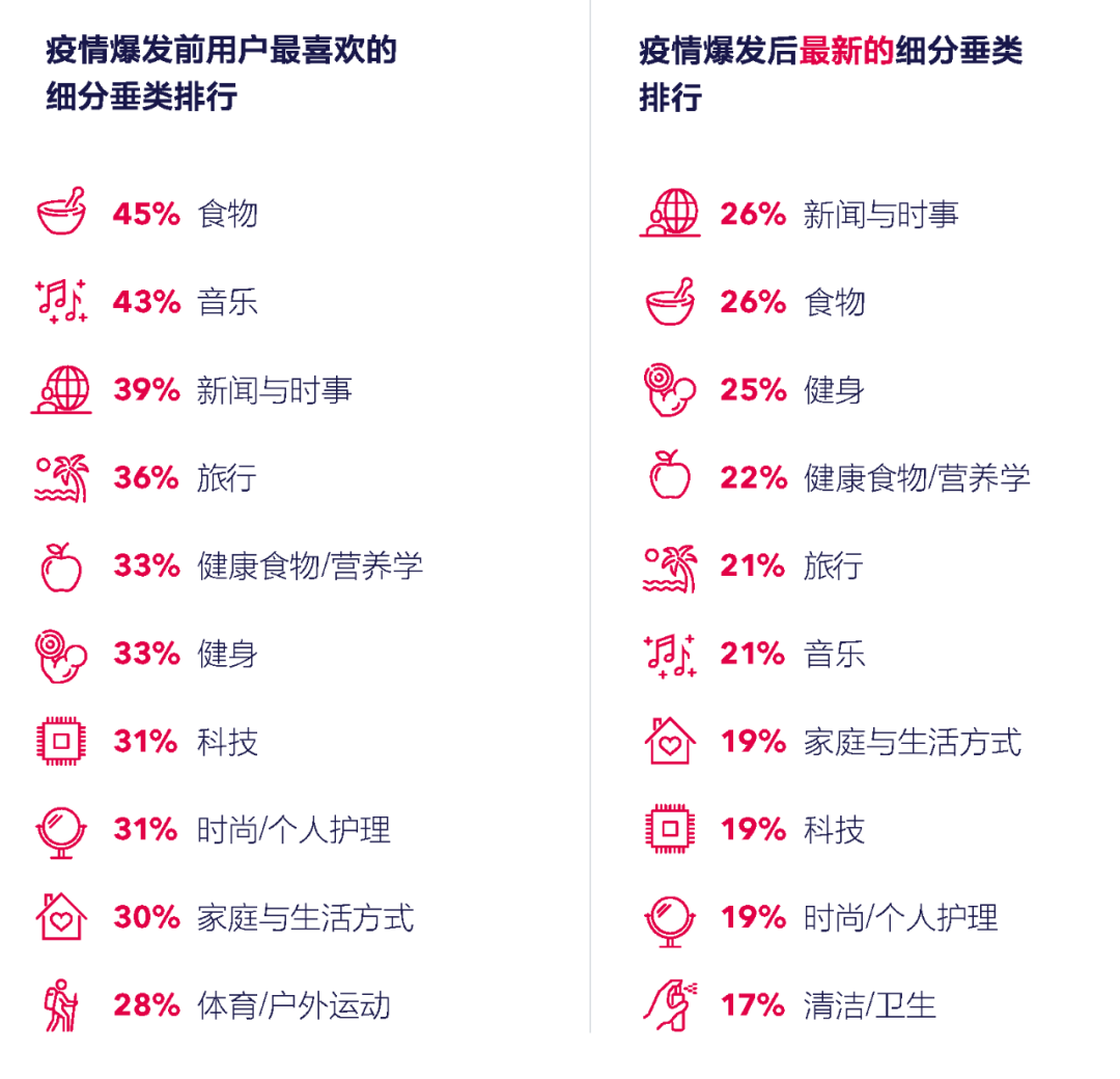 自从疫情爆发以来,新闻和时事、美食、健身和营养学等类别新粉丝增长最快。