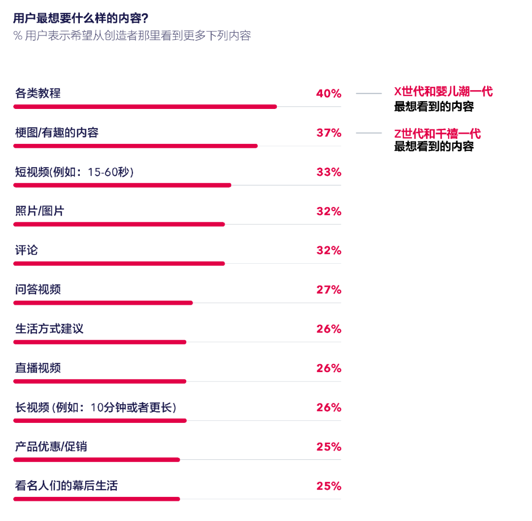 也有一些值得注意的代际差异。Z世代最想要的内容是梗图/有趣的内容(45%)和关注创作者生活的幕后内容(37%),这明显高于其他群体。梗图和有趣的内容也是千禧一代的首选。梗图不仅在最需要的时候以幽默的方式回应,还能帮助用户以一种熟络的方式交流和表达自己。与此同时,对于X世代和婴儿潮世代来说,最重要的内容选择是操作教程,分别为43%和47%。对于老一代人来说,操作教程比Z 世代人重要得多。