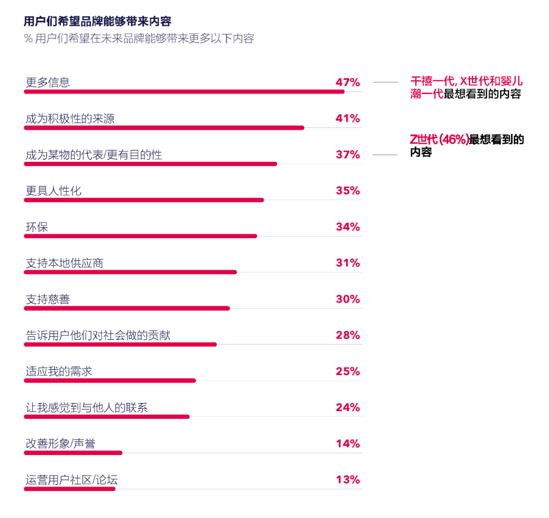 我们发现,用户期待品牌信息丰富(47%),成为积极的源泉(41%),代表某种东西/有目的(37%),更人性化/有个性(35%)。