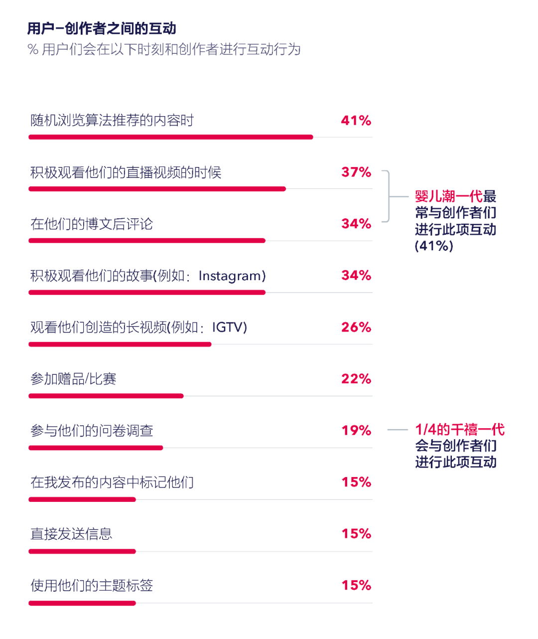 人们以多种不同的方式与创作者互动。许多粉丝积极与影响力博主互动;37%的人认为他们会积极观看直播视频,34%的人会在帖子上留下评论,并积极观看他们的故事,而41%的粉丝在浏览他们的历史内容时也会与创作者互动。