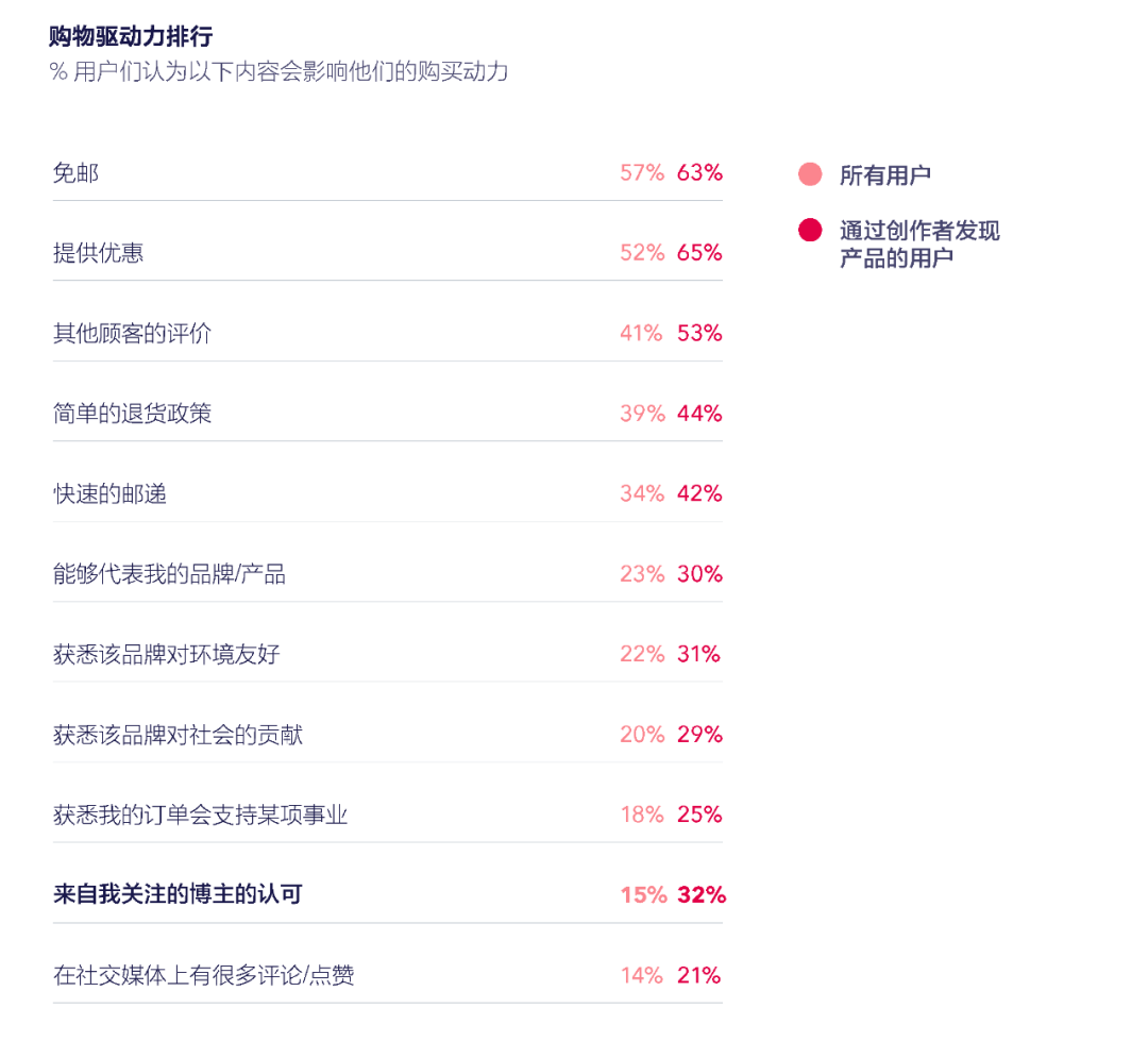 用户通常被实际、方便和有形的利益所驱使,这就是为什么像折扣、免费配送、简单退货政策和快速配送等功能是关注影响力博主的用户最想要的一些功能。这也是很多“点赞”或社交媒体上的好评论这样的功能会落在最后的原因。相反,粉丝更受其他用户评论的激励,这一群体中有五分之二的人将其他顾客的评论作为购买动机。