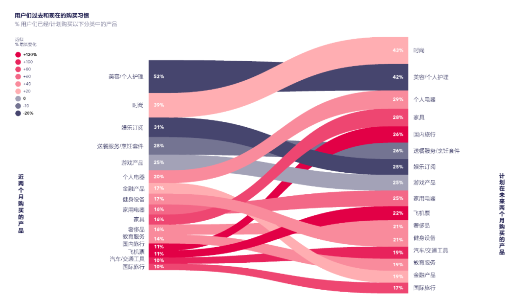 根据我们对KOL的调查,在过去的两个月中,用户购买最多的类别是美容/个人护理(52%)、时尚(39%)、娱乐套餐(31%)和食品配送服务/烹饪包(28%)。时尚和美容/个人护理也是未来购物的首选,在不同世代、收入水平和性别中保持高位。有趣的是,在过去的两个月里,美容/个人护理是男性和女性购买最多的类别,这凸显了这一类别在性别上的潜力。