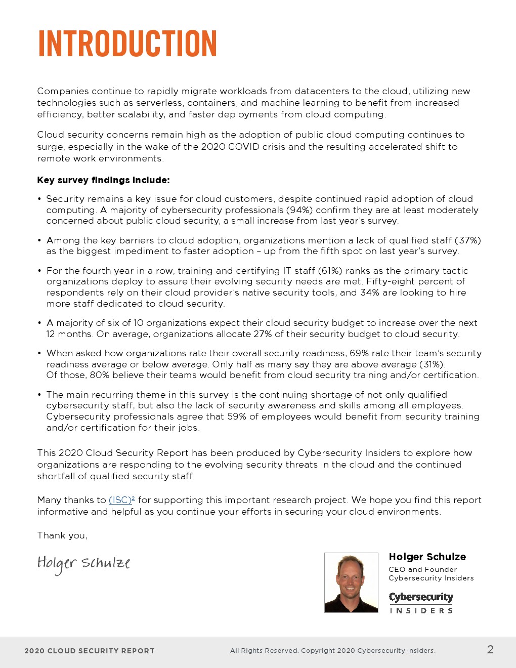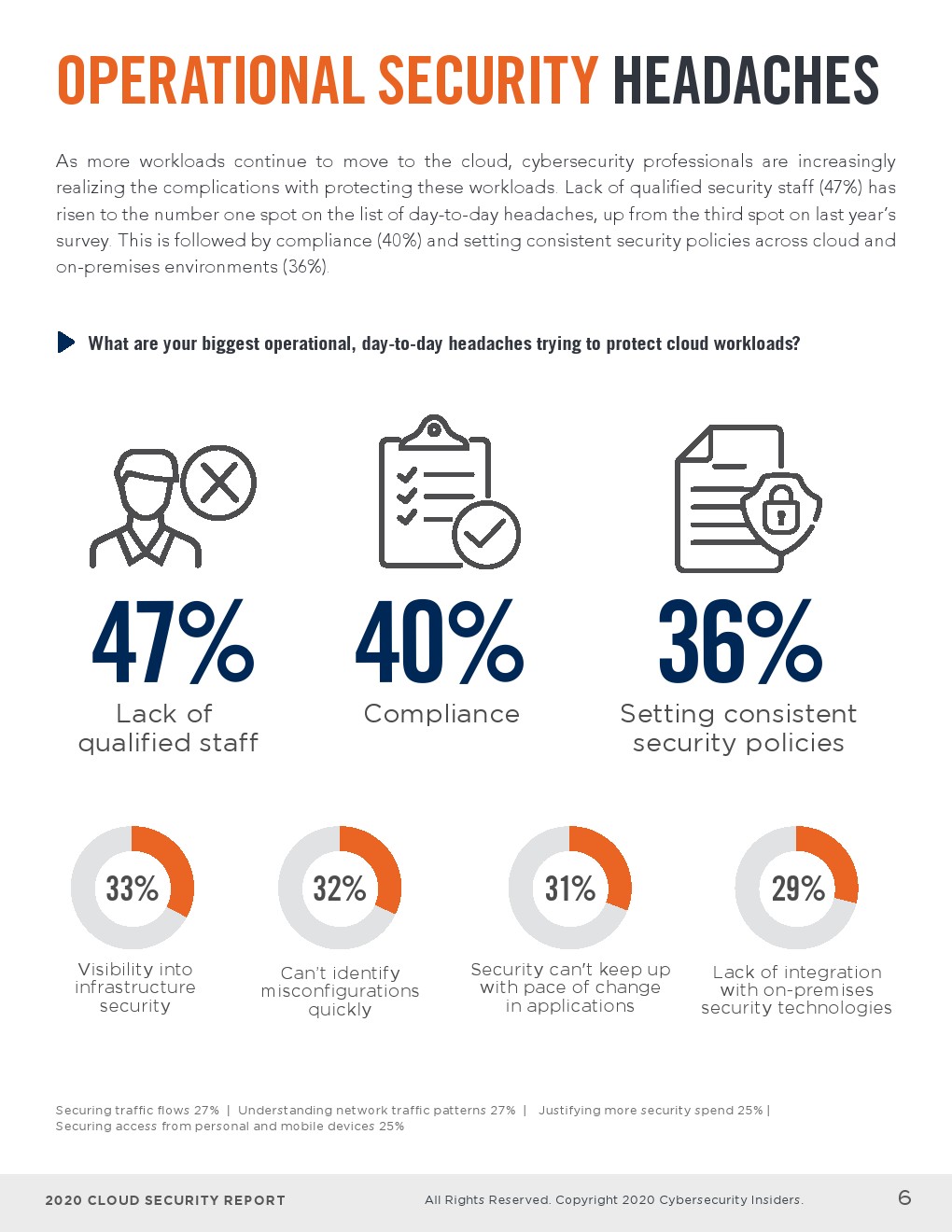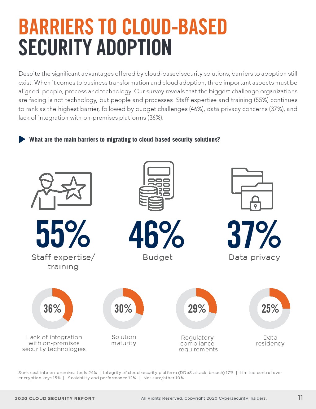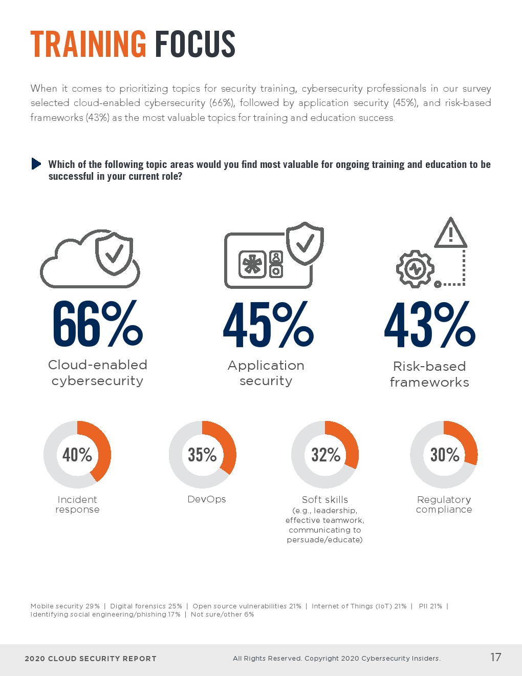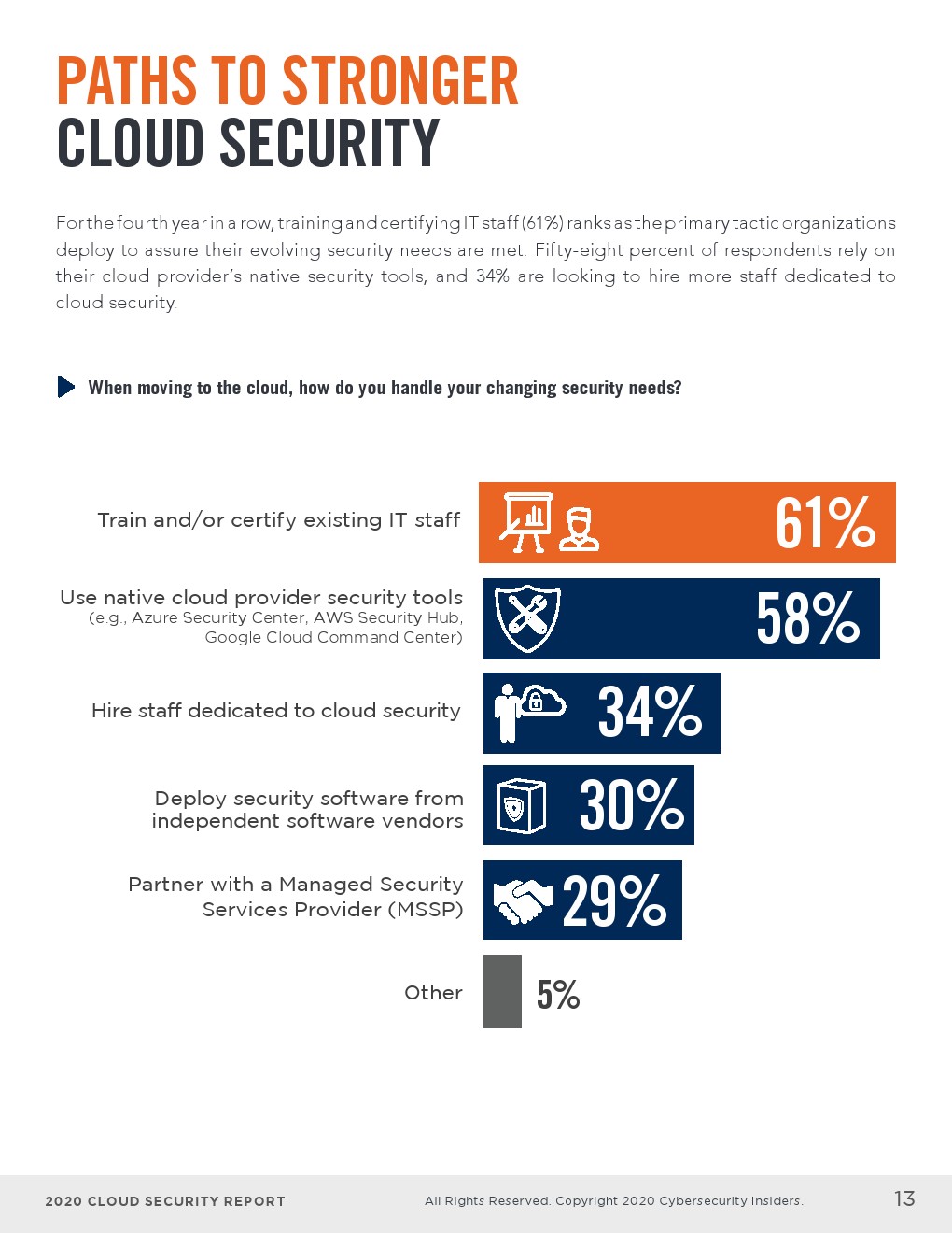 - 培训和认证IT员工(61%)连续第四年被列为企业为确保其不断发展的安全需求得到满足而部署的主要策略。58%的受访者依赖云提供商的原生安全工具,34%的受访者希望雇佣更多致力于云安全的员工。