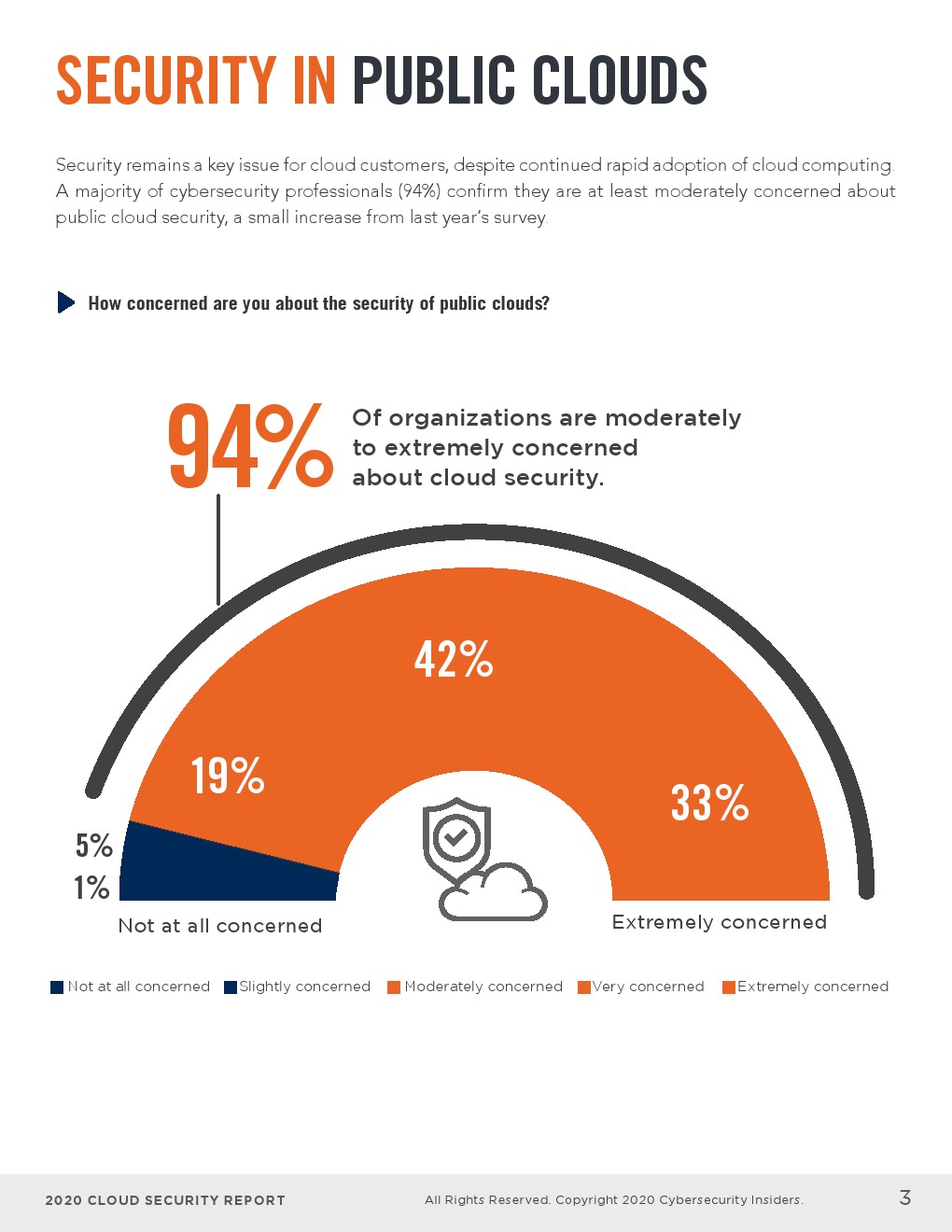 - 大多数网络安全专业人士(94%)表示,他们至少对公共云安全有一定的担忧,比去年的调查略有增长。
