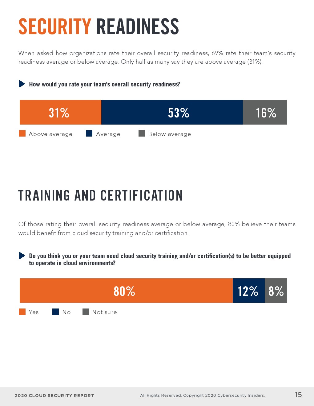 - 当被问及企业如何对其整体安全就绪进行评分时,69%的企业将其团队的安全就绪水平评为中等或低于平均水平。只有一半的受访者认为其高于平均水平(31%)。其中,80%的受访者认为他们的团队将受益于云安全培训和/或认证。