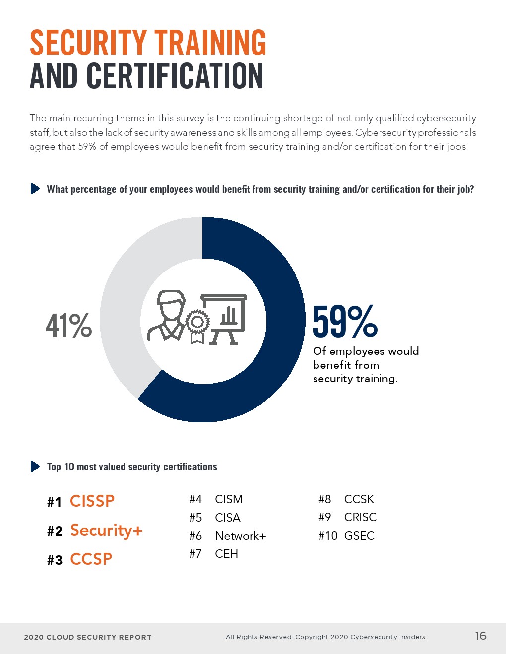 - 网络安全专业人士认为,59%的员工将受益于其工作的安全培训和/或证书。