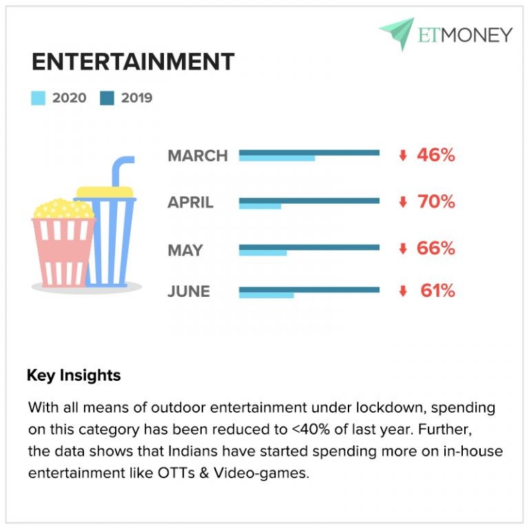4月份用于娱乐的支出同比下降了70%。但是,在5月和6月,随着人们越来越习惯于封锁状态,OTT平台和网络游戏支出跃升了10%。