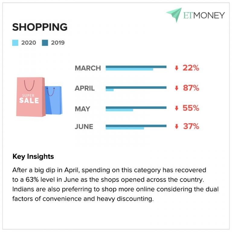 6月份,购物支出回升至63%,略低于封锁开始前的3月份。购物支出如此快速的复苏也是由于线上和线下零售商的大幅折扣。