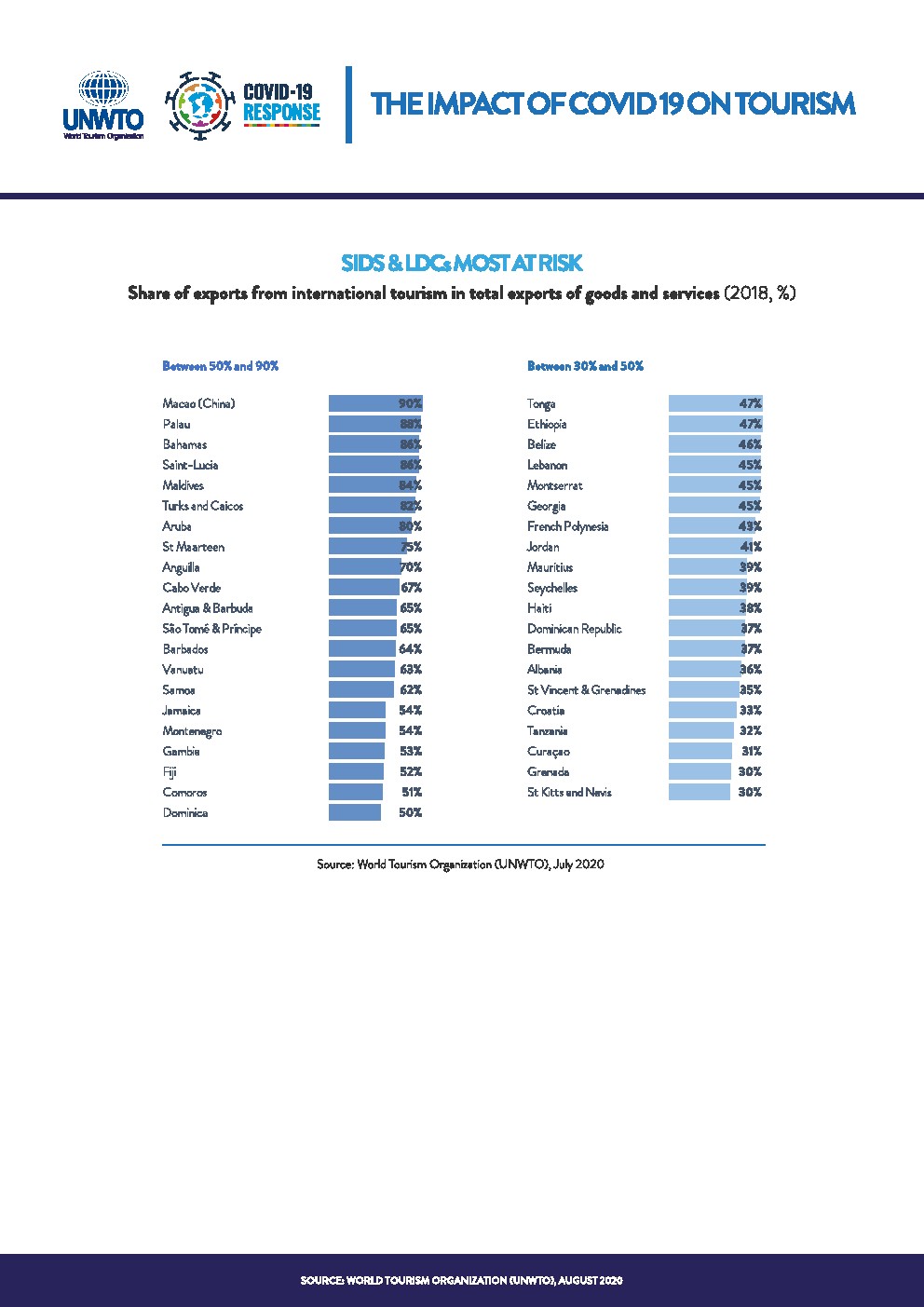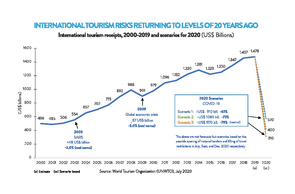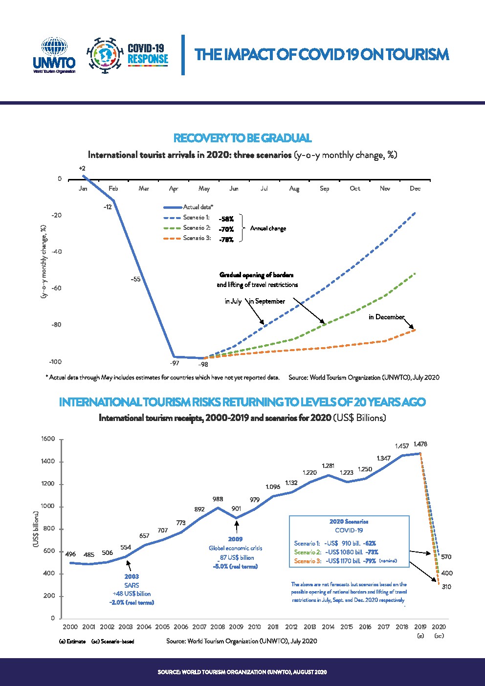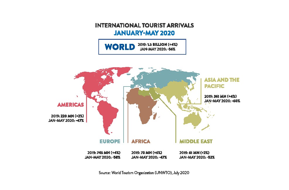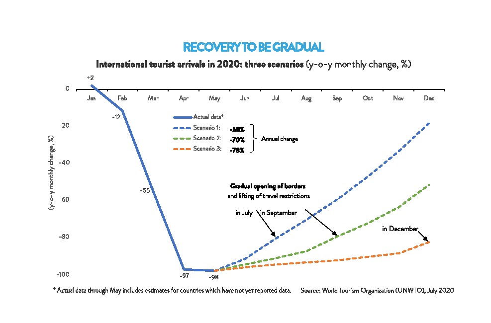 今年早些时候,联合国世界旅游组织发布了新冠肺炎大流行对国际游客影响可能有多大的估计。5月份公布的三种情景中,最积极的一种假设是7月份将取消旅行限制。即使在这种情况下,由于国际旅行仍然受到严格限制。世旅组织预计今年国际游客人数将比2019年下降58%。