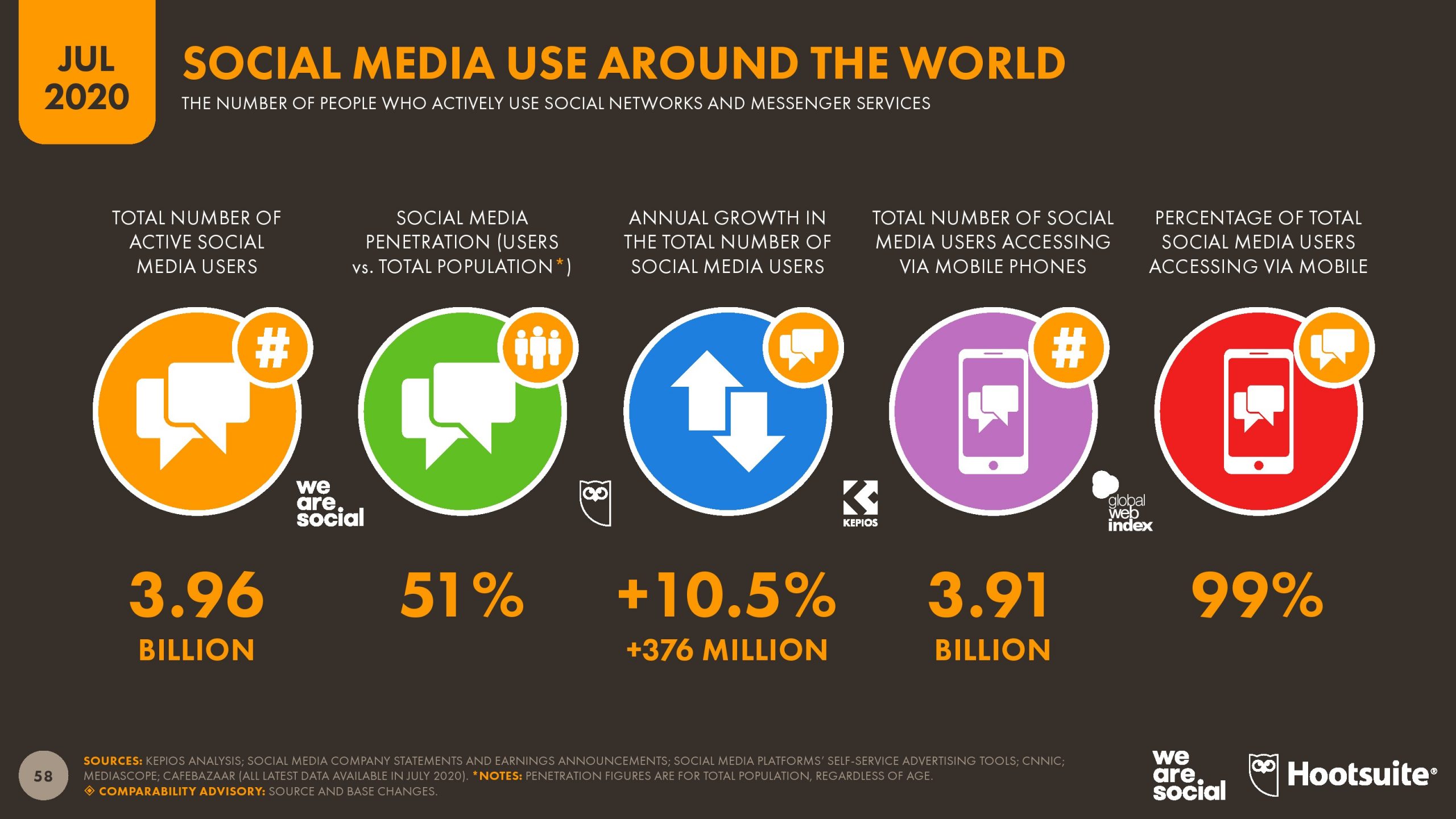 We Are Social发布了“2020年7月全球网络状态报告”。社交媒体用户在过去一年中增长了10%以上,到2020年7月初,全球社交媒体用户总数达到39.6亿。
