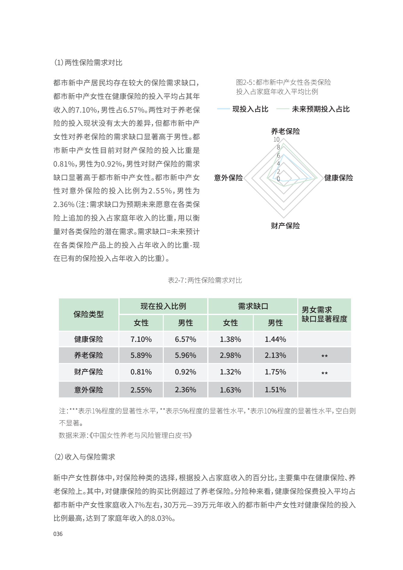 在通过调查女性愿意在保险上追加的投入占家庭年收入的比重作为需求缺口来衡量女性的潜在保险需求,经模型测算发现,女性普遍愿意在现有保险持有水平的基础上,加大对养老保险的购买。数据显示,未来女性在商业养老保险上的投入占年收入的比重将从5.89%上升至8.87%。