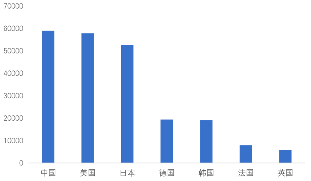 发明专利申请量和高水平科技论文发表量是衡量一个国家科技创新水平的重要指标。根据世界知识产权组织的统计数字,2019年全球共申请了26.58万件PCT发明专利,其中中国申请58990万件,首次超过美国成为发明专利的第一大申请国。在数字通讯、计算机技术、视听技术等领域,中国的发明专利数量均处于领先地位。2018年,中国发表科技论文数量为599386篇,位居美国(683003)之后,但已远超过排名第三第四的英国(211710)和德国(180608)。从论文被引用次数来看,中国与美国之间的差距进一步拉开,但仍居于第二位。以代表顶尖水平科学论文发表量的“自然指数”来衡量,中国2019年的得分为17724,相距美国(28330)亦具有较大差距,但远高于紧随其后的德国、英国和日本。