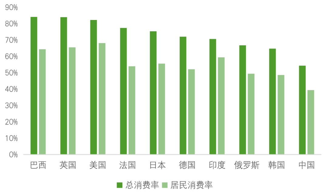 图1 代表性国家的居民消费率和总消费率(2018年)