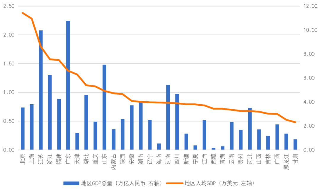 图4 2019年中国各省级行政单位GDP及人均GDP