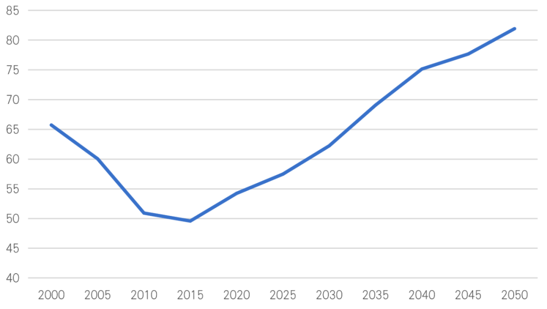 我国面临的人口老龄化压力从“十四五”时期开始会日趋加大。一是劳动年龄人口占比持续下降。自2014年以来,我国的劳动年龄人口数量已经处于逐年下降的趋势,劳动年龄人口在总人口中的比重由2010年的74.5%下降至当前的71%。二是人口“抚养比”持续上升。2015年,我国0-19岁和65岁以上人口数量与20-64岁人口数量之比为49.6%,根据联合国的数据,这一数字在2020年会上升至54.2%,到2035年将进一步上升至69.1%。这意味着,每100个劳动力对应的需要抚养的小孩和老人数量在未来十五年时间里会增加大约15人。三是人口结构变化会引发宏观经济结构的转型。在其他条件不变的情况下,人口老龄化会提高经济的消费率,降低储蓄率和投资率。预计“十四五”时期我国的总储蓄率和居民部门储蓄率都将呈下降趋势,而储蓄率降低又会在一定程度上制约固定资产投资和经济增长。四是老龄化时代的到来还可能引发一系列社会问题,如养老难问题、医疗负担问题、养老保险账户不平衡、人口代际转型过程中的房地产价格风险等。