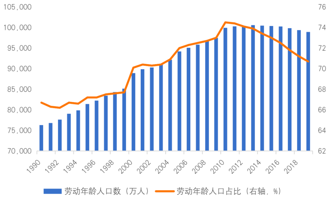 一是人口红利和低劳动成本优势趋于消失。自2014年以来,我国的劳动年龄人口数量已经处于逐年下降的趋势,劳动年龄人口在总人口中的比重由2010年的74.5%下降至当前的71%。农村剩余劳动力转移殆尽,农民工人数增速近年来持续放缓,目前已接近于零增长。在传统“人口红利”优势趋于衰竭的同时,人口老龄化压力和农民工市民化压力未来还可能导致“人口负债”。