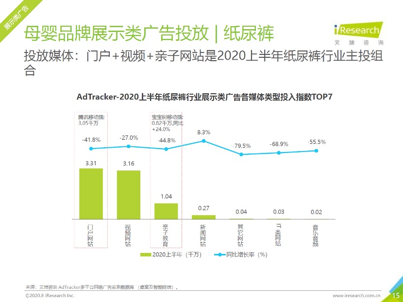 《报告》显示,宝宝树所在的亲子教育类平台位居2020上半年奶粉行业主要投放媒体第6位。纸尿裤展示类广告投放自2018年开始以Q2为投放旺季,受疫情影响,在2020上半年同比减少37.1%,门户+视频+亲子网站是2020上半年纸尿裤行业主投组合,其中宝宝树在亲子网站类投放总额中占比达78.8%,同比增长24%。根据报告,宝宝树作为中国最大、最活跃的母婴社区平台,其移动端与腾讯、爱奇艺、优酷同处纸尿裤全屏广告投放的TOP5增量来源,深受到主流母婴品类广告主的青睐。