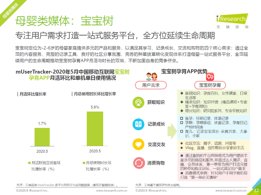根据应用市场的公开资料,宝宝树的旗舰产品宝宝树孕育App于2020年上半年更新了近30个版本,针对产品、内容、用户体验等进行了系列优化升级。例如,综合搜索量、问答频次、内容热度等多维度用户行为指标,上线“胎儿估重器”、“宝树牧场”等多款满足用户精致化、娱乐化需求的小工具;升级如“宝宝树专家团”、 “春风计划”等形态多元的原创内容体系,满足疫情后母婴家庭人群对健康、早教等权威品质知识内容的高依赖性需求。艾瑞数据显示,宝宝树月活跃独立设备环比增长率为1.7%,月总使用时长环比增长率为5.6%。《报告》进一步指出,宝宝树通过全面的内容服务、完整的记录工具、良好的社区分享氛围、完善的种草拔草转化变现体系打造母婴一站式服务平台,全面延续用户的生命周期,有效实现宝宝树孕育APP月活与时长的双增,不断加固自身的竞争壁垒。