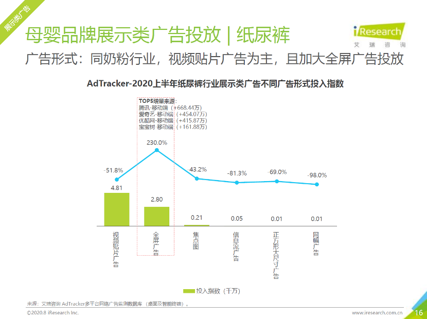 对于品牌而言,通过宝宝树平台能够精准触达消费者,实现从“认知-种草-拔草”的营销闭环,打通完整的营销链路。艾瑞《报告》指出,纸尿裤展示类广告投放以视频贴片广告为主,且加大全屏广告投放,其中宝宝树移动端增量达161.88万,与腾讯、爱奇艺、优酷同为TOP5增量来源。