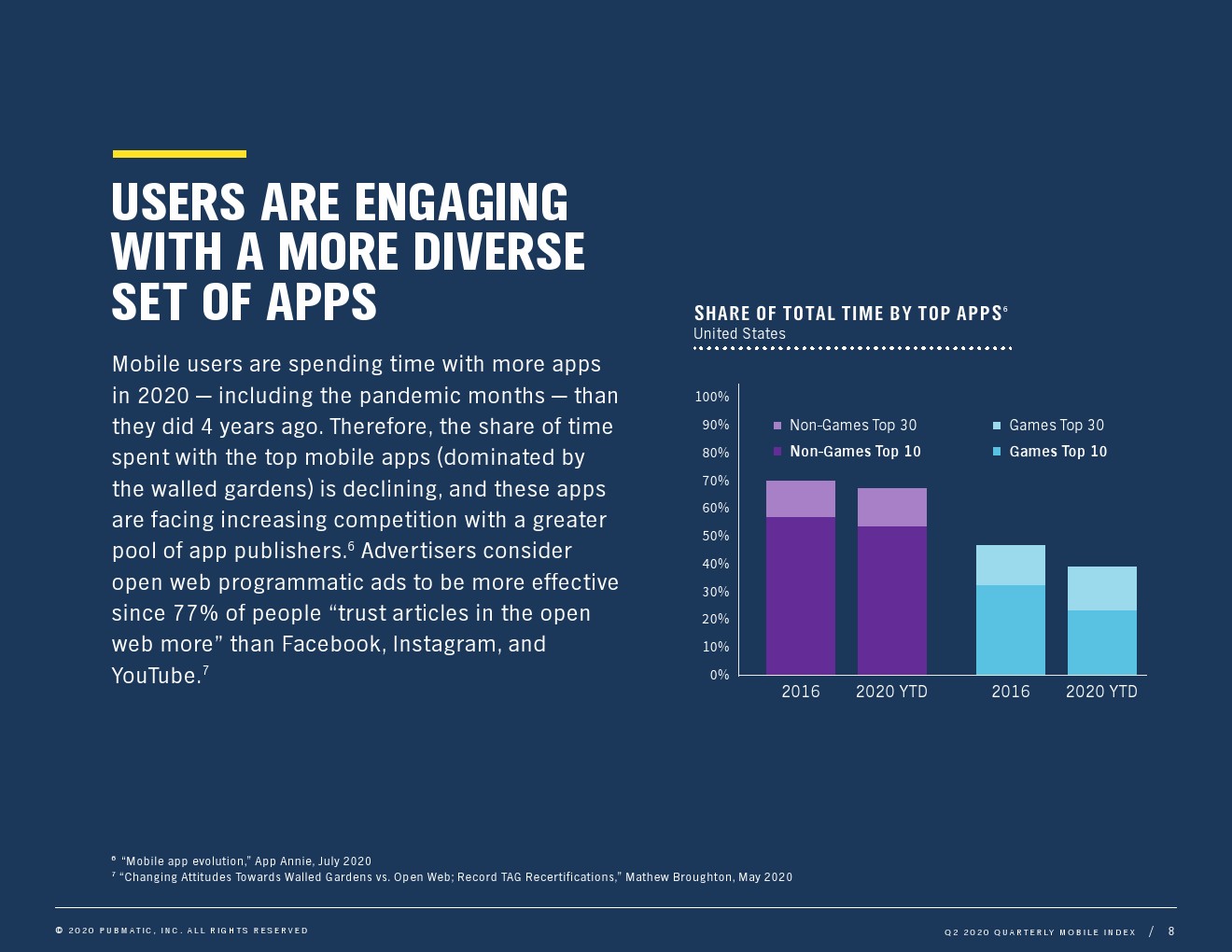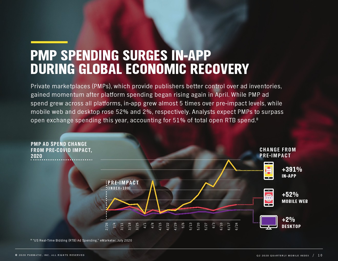 私人市场(PMP)广告支出在所有平台上都有所增长,应用内广告支出几乎是大流行前水平的5倍。在大流行期间,PMP一直受到广告主的欢迎,因为它们提供了媒体广告程序化购买的灵活性和价值,并结合了更多的控制。