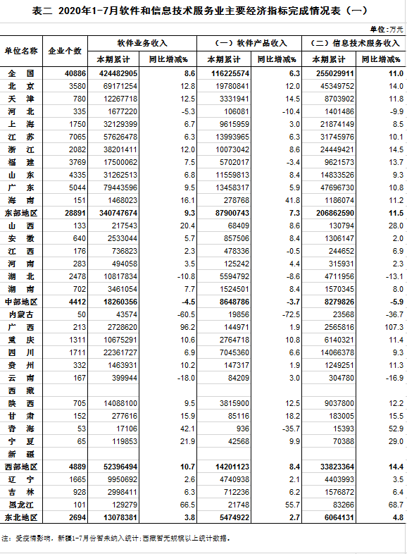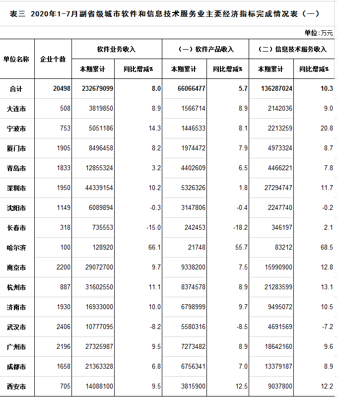 工信部:2020年1-7月软件和信息技术服务业主要指标 更多阅读:工信部:2022年软件和信息技术服务业统计公报工信部:2020年中国软件和信息技术服务业综合发展指数报告工信部:2020年软件和信息技术服务业统计公报工信部:2020年软件和信息技术服务业年度统计数据工信部:2020年软件和信息技术服务业统计公报工信部:2020年软件和信息技术服务业统计公报主要指标表工信部:2020年1-11月软件和信息技术服务业主要指标分省表工信部:2021年前三季度软件和信息技术服务业主要经济指标完成情况表工信部:2021年前三季度副省级城市软件和信息技术服务业主要经济指标完成情况表工信部:2019年软件和信息技术服务业统计年报工信部:2013年1-7月软件和信息技术服务业主要经济指标完成情况表工信部:2021年前三季度软件和信息技术服务业主要经济指标完成情况表工信部:2021年前三季度软件和信息技术服务业主要指标工信部:2020年1-11月软件和信息技术服务业主要指标分省表工信部:2020年1-8月通信业经济运行情况