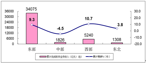 东、西部地区软件业收入保持较快增长。1-7月,东部地区完成软件业务收入34075亿元,同比增长9.3%。中部地区完成软件业务收入1826亿元,同比下降4.5%。西部地区完成软件业务收入5240亿元,同比增长10.7%。东北地区完成软件业务收入1308亿元,同比增长3.8%,四个地区软件业务收入在全国总收入中的占比分别为:80.3%、4.3%、12.3%和3.1%。