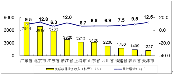 主要软件大省业务收入增速持续回升。1-7月,软件业务收入居前5名的省份中,广东、北京、江苏、浙江和上海分别增长9.5%、12.8%、6.3%、12.0%和6.7%,五省市合计软件业务收入占全国比重为65.2%。